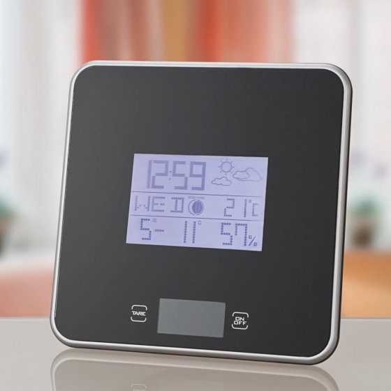 Uw gasten zullen genieten van het ultramoderne, goed ontworpen weerstation, die bij u aan de muur hangt! Op het grote LCD-scherm met blauwe achtergrondverlichting kunt u ruimte temperatuur, vochtigheid lezen, tijd en datum is uitstekend te zien. Ook een alarmfunctie is geïntegreerd. Leg ze op de tafel, en u hebt een ultradunne elektronische digitale weegschaal met een weeg oppervlak gemaakt van hard glas! Vruchten en bak ingrediënten maar ook brieven en kleine pakketten tot 3 kg, worden op 1 g nauwkeurig gewogen. Deze ELEKTRONISCHE WEERSTATION MET WEEGSCHAAL is een klein technologisch meesterwerk en ideaal voor keuken of bureau. Hij kan worden opgehangen of neergezet dankzij uitklapbare sokkel.