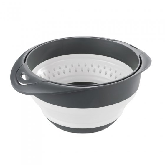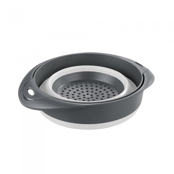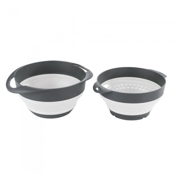 Les bols et les passoires volumineux prennent beaucoup de place dans les placards de cuisine – cela est surtout embêtant dans les maisons de vacances et les camping-cars, à cause des petits placards. L'ENSEMBLE BOL ET PASSOIRE est le choix idéal dans ce cas. D'abord parce que les deux éléments s'encastrent parfaitement l'un dans l'autre, ensuite parce qu'on peut les aplatir à env. 6 cm pour qu'ils prennent moins de place en hauteur. Vous aurez du mal à trouver des ustensiles mieux adaptés au camping. Dimensions (l x P x H, non aplatis) : bol env. 27 x 20 x 11 cm, passoire env. 24 x 19 x 10 cm. Ne gaspillez pas l'espace précieux dans vos placards !