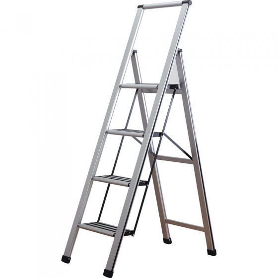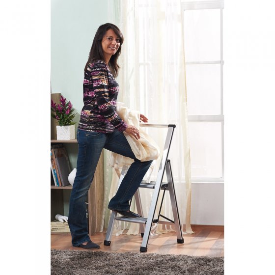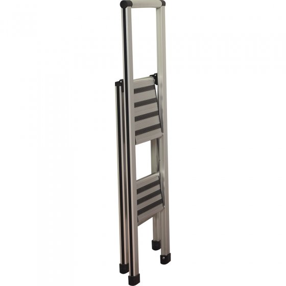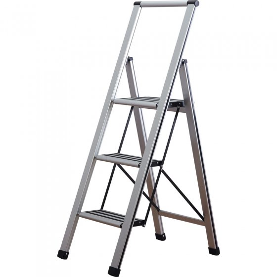 Vous désirez un appui bien stable pour accrocher vos rideaux ou pour tous les travaux qui exigent de la hauteur ? Faites confiance à cet ESCABEAU PLIABLE DE SÉCURITÉ ! Sa structure robuste en aluminium (charge maximale 150 kg) avec arceau de sécurité garantit une stabilité optimale. Les niveaux grand format (marches : env. 32 x 15 cm, surface d’appui : env. 32 x 23 cm) permettent une utilisation en toute sécurité. La surface est rainurée et gommée. Dépliable d’un seul geste. Dim. repliée : seulement env. 5 cm d’épaisseur, pratique pour le rangement ! Version qualitative en aluminium avec embouts antidérapants en synthétique. En matière d’échelle, misez sur la sécurité !