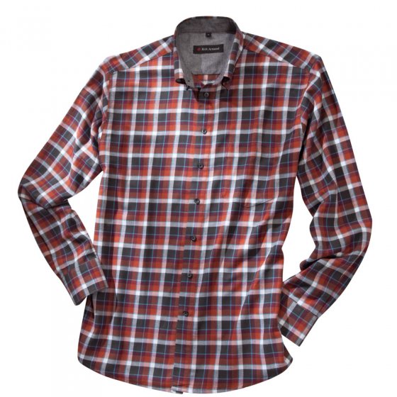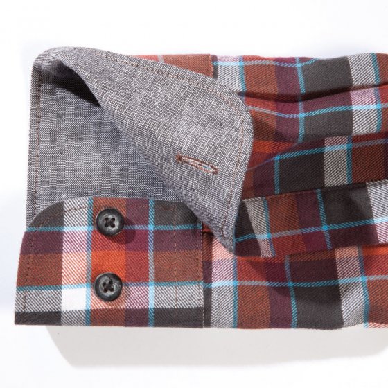Ruithemden van flanel zijn modisch actueel en niet alleen voor natuurmensen! Onze EXCLUSIEVE FLANELOVERHEMD werkt door zijn klassieke weef ruit in de hoofdkleur baksteen sportief en stijlvol tegelijkertijd. Kan gecombineerd worden met (nagenoeg) alle herfstkleuren. De zachte, warme flanel,van 100% katoen is zeer fijn opgeruwd en het toppunt van comfort. Het slaat de lichaamswarmte op en is goed isolerend tegen de kou. Ook de uitstekende afwerking: Contrasterende Chambray afwerking op de kraag en manchetten en zijn kenmerkend voor eerste klasse kwaliteit. Button Down Kraag, borstzak, verstelbare manchetten met twee knoppen, afgeronde zoom. Machine wasbaar. Een robuuste, unieke veelzijdig en zeer comfortabele overhemd waar u veel van zal genieten!