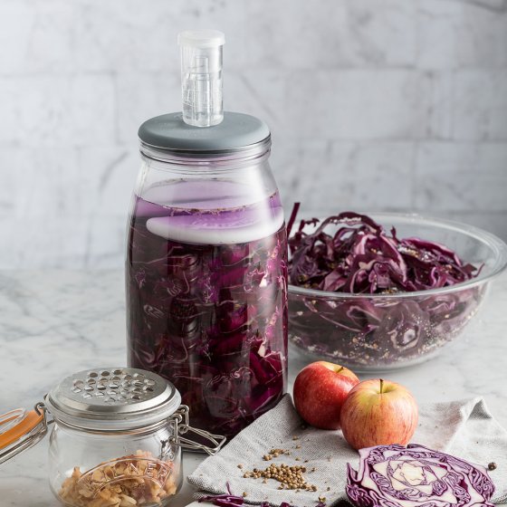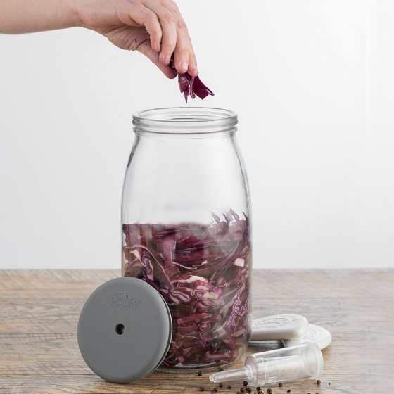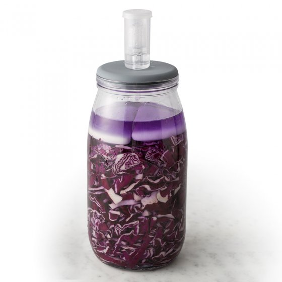Vroeger was het vanzelfsprekend dat men na de oogst voorzieningen trof voor de herfst en winter: groenten en fruit werden bewaard, zodat men ook dan vitaminerijk kon eten. Dat is weer helemaal terug! Met de FERMENTATIEPOT MET TOEBEHOREN kunt u komkommers, bieten, rode kool en vele andere gezonde groenten op de traditionele manier bewaren zonder te verhitten, zo blijven de gevoelige vitamines en mineralen op de best mogelijke manier behouden. Naast de grote pot van 3 liter met siliconen deksel en ontluchtingsventiel zijn ook keramische gewichten bij de levering inbegrepen. Afmetingen glazen pot (Ø x h): ca. 13 x 35 cm. Of het nu gaat om gezonde zuurkool of zelfgemaakte rode kool: trakteer uzelf op iets lekkers uit deze glazen pot!