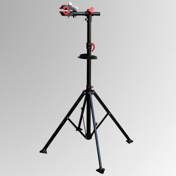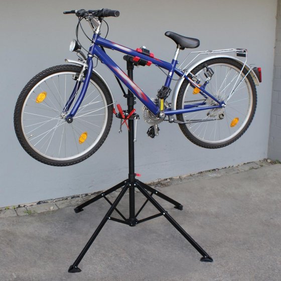 Pijn in de rug van bukken? Zere knieën? Problemen met kiepende fietsen? Gegarandeerd niet meer - want nu zorgt de FIETS MONTAGESTANDAARD voor veiligheid en comfort! Zijn vier poten statief zorgt voor een stevige stand – daar valt niks meer! De beugel kan 360 ° te draaien, daardoor is het werk in allerlei houdingen mogelijk. Bovendien, de standaard en telescopische stang zijn in hoogte verstelbaar. Bukken is nu passé - gemakkelijker kan het niet! U klemt het frame in de beugel met snelsluiting en zet het voorwiel vast – meer niet! Gevouwen verdwijnt de standaard ruimte besparend in elke hoek. Ook voor Y en oversized frames geschikt. Een echte verlichting bij alle werkzaamheden