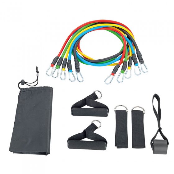 De 11-delige fitnessbandenset voor uw dagelijkse fitnessprogramma thuis: hiermee kunt u uw armen, benen, schouders en torso inclusief buik en billen trainen. De elastische banden hebben verschillende rekniveaus, zodat u tegen verschillende weerstanden kunt werken (4,5 kg-45 kg). Oefeninstructies speciaal ontworpen voor de behoeften van senioren zijn inbegrepen. Andere accessoires: handgrepen, enkelband, deuranker, beschermhoes. Lengte elke band: ca. 125 cm.