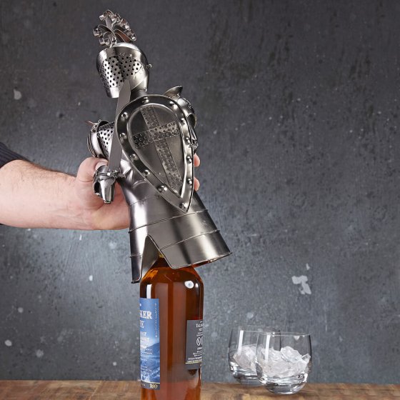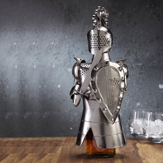 Stijlvoller kan men de kostbare inhoud van een fles niet veilig opbergen of cadeau geven: de FLESOPZET RIDDER is uitgevoerd met schild, zwaard en andere luxueuze details, en biedt onder zijn uitrusting ruimte aan verschillende soorten flessen. Met de hand gemaakt, dus elk model is een uniek exemplaar. U dacht misschien dat een fles cadeau geven heel saai was, maar met deze originele flesopzet is dat niet meer zo. Ook mooi als decoratie en misschien zelfs wel als afschrikwekkend middel voor degenen die de fles willen stelen. Afmetingen (H x Ø): ca. 35 x 15 cm. Een blikvanger in de vitrinekast en een origineel flescadeau.