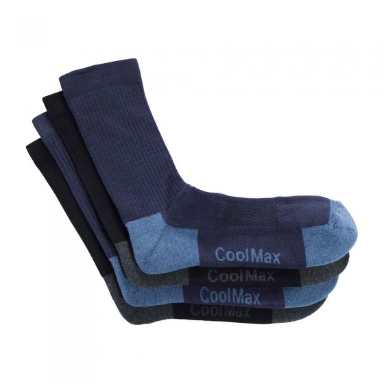 Diese hochmodernen Socken sind ein Geheimtipp gegen schwitzende, müde Füße! Die Hightech-Faser Coolmax® leitet Feuchtigkeit aktiv und blitzschnell vom Fuß weg und vermittelt ein kühles, trockenes Klima. Die weiche Frotteesohle dämpft spürbar den Auftritt und beugt Ermüdung vor. Feiner Netzstrick auf dem Spann erlaubt viel Luftzirkulation, und ein leichter Stretch-Effekt sorgt für glatten, faltenfreien Sitz. Erfrischender Komfort für das Wohl Ihrer Füße!• Stulpe im Rippenstrick, breiter Komfortbund. 77 % Polyester (Coolmax®), 13 % Elasthan, 10 % Polyamid, maschinenwaschbar, trocknergeeignet