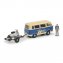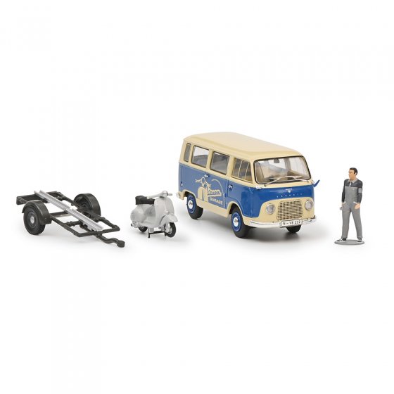 La classe des petits transporteurs connut un essor considérable pendant les années du miracle économique à partir de 1950. Outre le « Bulli » de VW, on s'arrachait entre autres le Tempo Matador et la fourgonnette DKW-Schnelllaster. Toutefois, en matière de puissance du moteur, la Ford FK 1000 était en tête : avec ses 39 cv, elle battait tous ses concurrents. Le modèle 1:43 de la FORD FK 1000 AVEC REMORQUE DE VESPA représente ce petit costaud en attelage et doté d'une peinture bicolore d'époque ; le tout est complété par une figurine de mécanicien à l'échelle. Dimensions (longueur totale L x l x H) : env. 18 x 4 x 5 cm. Ce modèle de plusieurs pièces fera le délice de tous les fans de véhicules historiques – dont la Vespa fait bien sûr partie !