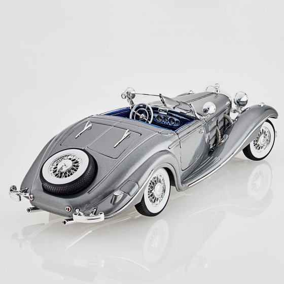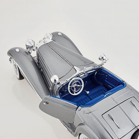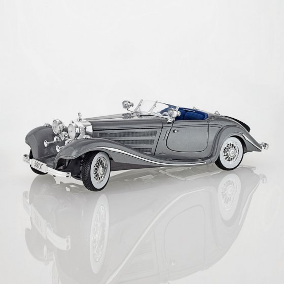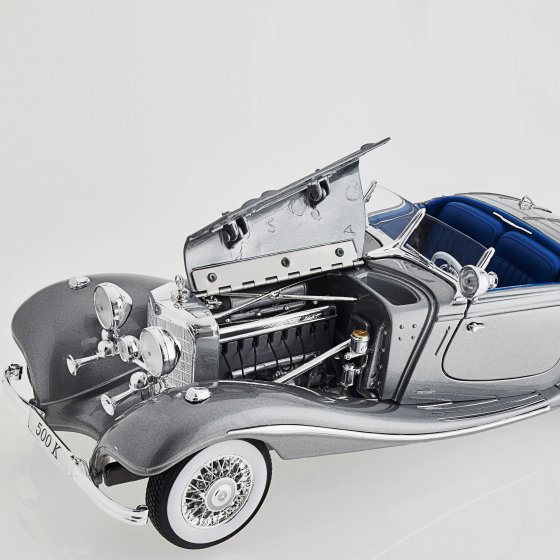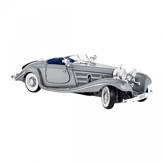 La série 500K de Mercedes a fait forte impression dans les années soixante. Ce bolide à l’allure rutilante atteignait une vitesse de pointe de 160 km/h grâce à son moteur de 5 l et 8 cylindres suralimenté par un compresseur. Il était à l’époque le symbole par excellence de la voiture de sport rapide et luxueuse. Il fallait toutefois être vedette de cinéma ou entrepreneur pour pouvoir se l’offrir. Aujourd’hui, ce modèle à l’échelle 1:18 du MERCEDES BENZ 500K ROADSTER 2+2 est accessible à tous. L’essieu avant est dirigeable, toutes les portières et capots s’ouvrent, y compris la banquette escamotable dans le coffre – le "siège de la belle-mère". Longueur : env. 29 cm. Ajoutez une touche de luxe superlatif à votre collection !
