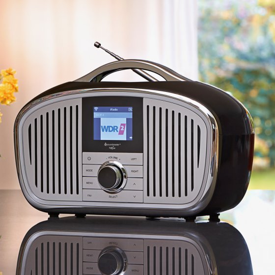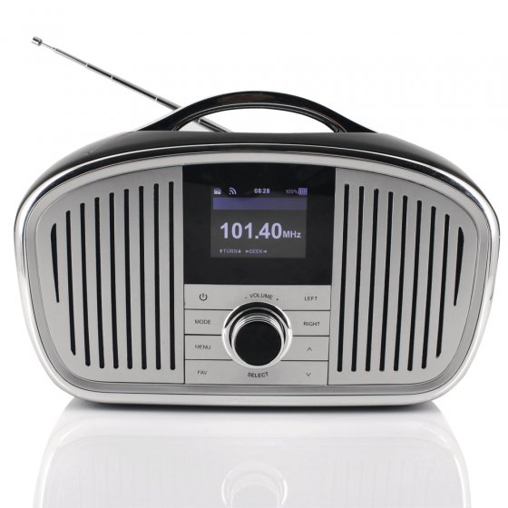 Au premier coup d'œil, cette radio ressemble à une pièce vintage classique : design rétro, bouton au milieu, antenne intérieure extensible. Au deuxième coup d'œil, vous remarquerez toutefois qu'elle révèle bien plus de fonctionnalités : transfert wifi, radio Internet, récepteur DAB+ (en plus du récepteur AM/FM normal) et Digital Living Network Alliance (DLNA) ! L'écran couleur vient ajouter la touche finale à cette RADIO RÉTRO INTERNET ET DAB+, aux équipements ultra modernes et aussi polyvalente que les radios high-tech : elle affiche par exemple le nom d'un titre grâce à la technologie RDS ou diffuse les morceaux présents sur votre réseau local. La radio est également munie de différents ports (écouteurs, AUX-IN, USB) et peut lire les fichiers de musique stockés sur une clé USB. Alimentation par batterie Li-Ion, câble de chargement avec adaptateur secteur livré. Dimensions (L x l x H) : env. 10 x 26 x 16 cm. Profitez d'équipements de dernière génération dans un boîtier classique !