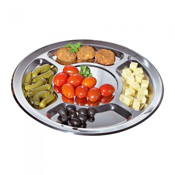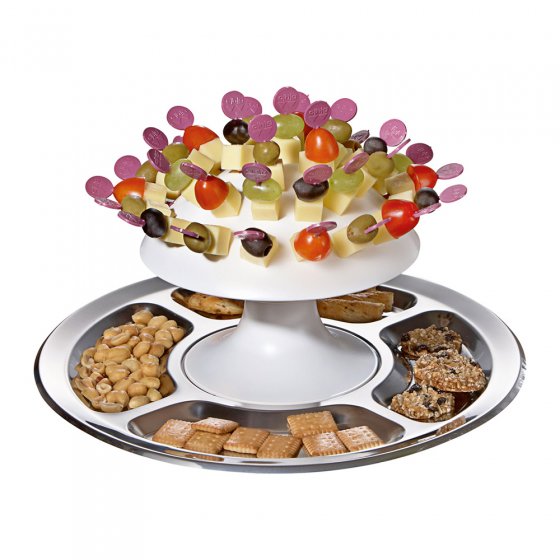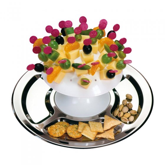 Les années 70 n’ont pas seulement été marquées par la musique disco et une mode au style bien marqué mais également par de bonnes idées, comme par exemple notre SERVITEUR "CHAMPIGNON". Ce concept, à la fois original et pratique d’un socle sur lequel vous pouvez planter des mini-brochettes de Fingerfood, est aujourd’hui encore très en vogue ! Vous aimeriez servir à vos convives des amuse-gueules en toute simplicité ? Il vous suffit de planter sur ce champignon vos mini-brochettes de fromage, de fruits ou de pralines : les possibilités sont infinies. La partie inférieure, composée de 5 segments en acier inoxydable, pourra également accueillir vos biscuits apéritif, noix, etc. Le champignon en plastique est amovible : vous pouvez donc utiliser séparément le champignon et l’assiette. Diamètre de l’assiette : env. 32 cm. Hauteur du champignon : env. 13,5 cm. 32 pics à brochette inclus. Revisitez les années 70 lors du prochain réveillon ! Avec ou sans musique disco, vos invités vont adorer se servir sur ce "champignon" !