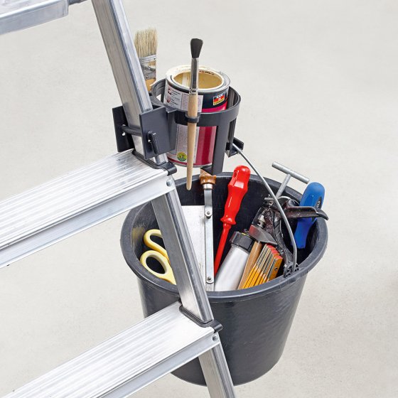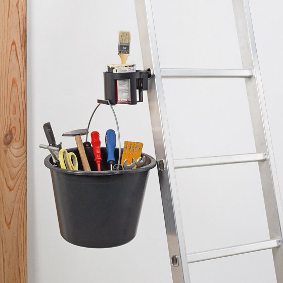 Quand on travaille sur une échelle, on tient généralement quelque chose dans les mains, que ce soit un pot de peinture, de colle ou encore un panier (pour cueillir des fruits). Il ne vous reste donc qu’une main libre. Notre SERVITEUR D'ÉCHELLE "PREMIUM" vous promet une plus grande "liberté de mouvement" : vous pourrez y suspendre votre seau et vos récipients à anse et y ranger vapos, tubes, pots de peinture, etc. Les pinceaux se mettent dans les petites ouvertures. Grâce à son système de fixation multifonctions, ce serviteur se fixe aussi bien sur une échelle à poser que sur un escabeau. Dim. : hauteur env. 9,5 cm, Ø env. 11 cm. Charge maximale : 3,5 kg. Gardez les mains libres !