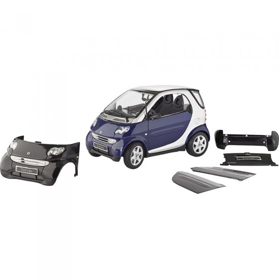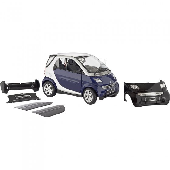 Une petite voiture, un maximum d’effet : lorsque la SMART FORTWO fut présentée en 1997 au salon international de l’automobile, l’étonnement fut au rendez-vous : depuis l’époque du scooter à cabine, on n’avait plus vu de voiture réduite à ce point à ses fonctions essentielles. Cette mini-voiture, tout droit sortie des usines Daimler Benz, est si petite qu’on peut la garer perpendiculairement au trottoir ; et pourtant, c’est une très belle voiture, offrant suffisamment de place pour 2 personnes et des bagages. Conçue à l’origine pour être une "voiture économe", la Smart Fortwo s’est vite transformée en objet design grâce à ses fonctionnalités innovantes, comme par exemple ses panneaux de carrosserie interchangeables. Ce modèle-réduit à l’échelle 1:18 en zinc moulé sous pression n’a rien à envier à l’original en ce qui concerne la flexibilité : le capot, l’arrière, les portes et le hayon peuvent être changés très rapidement. Inclus dans la livraison : un lot de panneaux bleus et un lot de panneaux noirs. Les portes et le hayon s’ouvrent, l’essieu avant tourne. Dim. env. 14 x 8 x 9 cm. On parie que ce modèle-réduit saura se garer sur la moindre petite parcelle de votre meuble de séjour ?