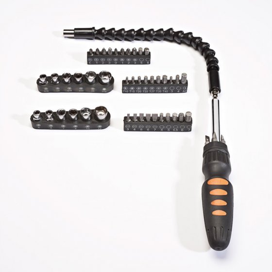 Certaines vis ne sont tout simplement pas accessibles avec un tournevis normal – quelle ne soit la position dans laquelle on le met. C'est ici qu'intervient notre TOURNEVIS SOUPLE : avec lui, même les vis les moins accessibles se vissent et se dévissent puisqu'il est capable d'accéder jusque dans les coins ! Un arbre situé à l'intérieur empêche l'enveloppe extérieure de tourner en même temps. Autre avantage : le transfert de force est démultiplié. Fabriqué en acier carbone, poignée en plastique (recouvert de gomme). L'embout souple est amovible. Dim. : longueur (avec embout) env. 49 cm, Ø env. 3,5 cm. Avec cet outil, vous accédez à toutes les vis – même dans les coins les moins accessibles !