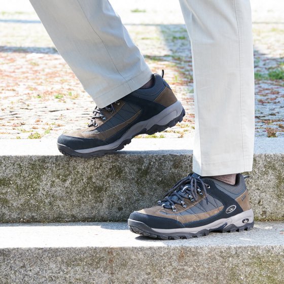 Vooral de voeten worden op de proef gesteld tijdens wandelingen en andere buitenactiviteiten. Voor een stabiele steun op een ongelijke ondergrond hebben deze functionele, maar daardoor niet minder comfortabele schoenen van suèdeleer een prettig beklede schacht en tong. Dankzij de waterafstotende Comfortex-membraan blijven uw voeten fris en droog, zelfs als u onderweg door een regenbui verrast mocht worden. Materiaal: suèdeleer, nylon, textiel, rubber.