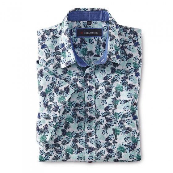 Dit GEDESSINEERDE ZOMEROVERHEMD heeft een heel nieuwe look. Het is voorzien van frisse bloemmotieven die men niet zo vaak ziet en ziet er door de koele tinten verzorgd en stoer uit. Bovendien heeft de stof van 100% katoen de karakteristieke, casual look van linnen: perfect voor wanneer het warm is en voor de vakantie. Het overhemd met korte mouwen is ademend en luchtig voor de huid en is wasbaar. Heel elegant is het beleg van chambray in de kentkraag en bij de knopenlijst. Het overhemd heeft een borstzak met knoop, en omdat de zoom afgerond is, kun je het goed over de band van de broek dragen.