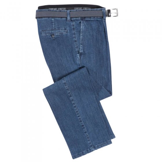 Deze GEPLOOIDE-JEANS combineert de elegante snit van plooibroek met het comfort van een eersteklas jeans! De elastische stof geeft u comfortabele bewegingsvrijheid, en blijft zelfs na herhaald gebruik in goede vorm: Deze broek kent geen “uitgezakte” knie! De klassieke plooi zorgt voor een comfortabele, gunstige pasvorm. De tailleband knelt niet bij langdurig zitten. De bewezen materiaalkwaliteit gemaakt van 98% katoen en 2% elasthan is robuust en stevig. Met 2 zijzakken, 2 achterzakken met knoop, machine wasbaar. Ook in korte maten. Een ander pluspunt: de elastische, bijpassende riem, bieden wij u gratis aan!
