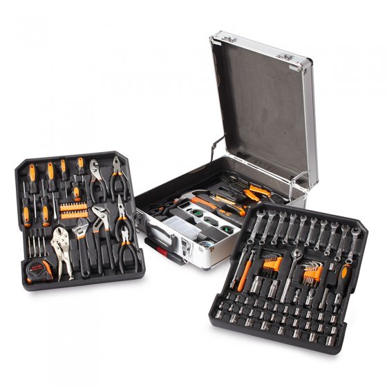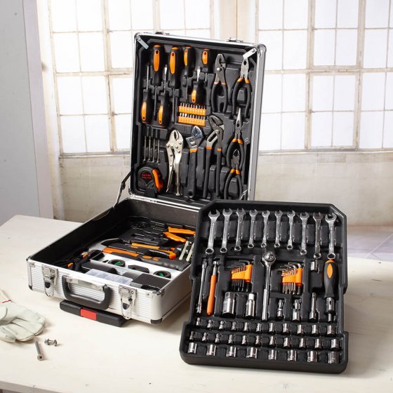 Voert u noodzakelijke reparaties in huis het liefst zelf uit? Met deze GEREEDSCHAPSTROLLEY bent u uitstekend toegerust. Hij bevat 186 onderdelen, overzichtelijk ingedeeld in 3 etages. Van de moersleutelset tot diverse tangen, schroevendraaiers en bits, een elektrisch lijmpistool en meethulpmiddelen is alles aanwezig. En bij gebruik in donkere hoeken of bij een stroomstoring zorgt vanaf nu de hoofdbandlamp voor goede zichtcondities en handsfree werkgemak. Dankzij de lichtlopende wieltjes en een uittrekbaar telescoophandvat is de trolley gemakkelijk overal mee naartoe te nemen. Kofferafmetingen (b x h x d): ca. 58 x 39 x 18 cm. Uitgebreid als een gereedschapskast, praktischer dan een gereedschapskist – klaar voor gebruik.