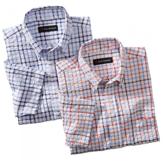 Wassen, drogen, dragen... een belofte, die u het leven makkelijker maakt en die door deze hemden van mooi Seersucker katoen, met gekrepte structuur die als synoniem voor langdurige koelte geldt, ingelost wordt. De mooie ruiten in blauw of oranje op witte ondergrond geven een zomers gevoel. Wij kunnen u deze GERUITE SEERSUCKER HEMDEN IN SET VAN 2 voor een speciale prijs aanbieden, die met het oog op de kwaliteit van makelij en afwerking super gunstig is. Twee hemden met korte mouw, die absoluut in uw koffer thuishoren?. 100% katoen, makkelijk te onderhouden, kreukherstellend. Staande buttondownkraag, Amerikaanse knoopsluiting, 1 op het design afgestemde opgezette borstzak en comfortplooi in de rug