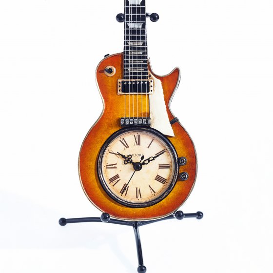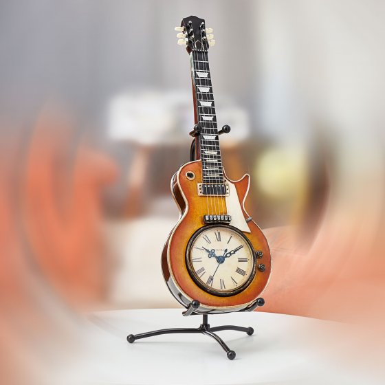 Het was de favoriet van rocklegenden Carlos Santana, Marc Knopfler en Eric Clapton: de beroemde “Gibson Les Paul“. Deze gitaar kwam in 1952 op de markt. De met de hand vervaardigde GITAARKLOK IN LES PAUL-STIJL herinnert ons aan deze memorabele gebeurtenis! De muzikale tijdmeter met voet is een echte blikvanger. Dat komt door de echte snaren waarmee het kleine kunstwerk is bespannen, de glanzende klankkast, alsook de fijne kam. Afmetingen van de klok (b x h x d): ca. 11,5 x 37 x 4 cm, Afmetingen van de voet (b x h x d): ca. 16 x 25 x 16 cm. Werkt op 1 AA-batterij (apart verkrijgbaar). Voortaan staat deze meesterlijke e-gitaar gewoon in uw woonkamer!