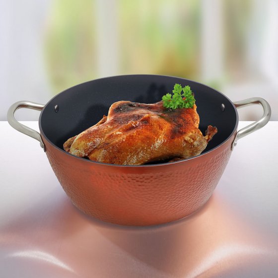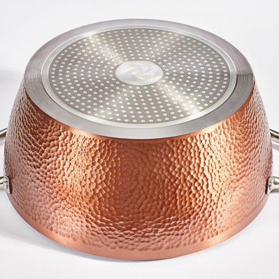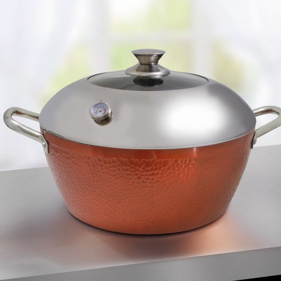 Als aanvulling op de grote pan is er nu de GROTE HAMERSLAGPAN: smoren, braden, eenpansgerechten koken, alles is met dit exemplaar mogelijk. Dankzij zijn indrukwekkende volume van 7 liter is de bereiding van grote gerechten geen probleem. Met behulp van de aan de glazen thermodeksel aangebrachte thermometer is de gaartemperatuur in de gesloten pan af te lezen. Handig voor het langere tijd garen op lage temperatuur. De trekvrije bodem (4 mm) slaat de warmte uitstekend op. De inhoud van de pan blijft lang warm. Afmetingen: Ø ca. 30 cm, hoogte met deksel: ca. 23 cm. Materiaal: aluminium. Met deze XXL-pan kunt u in de keuken de grootste uitdagingen aan.