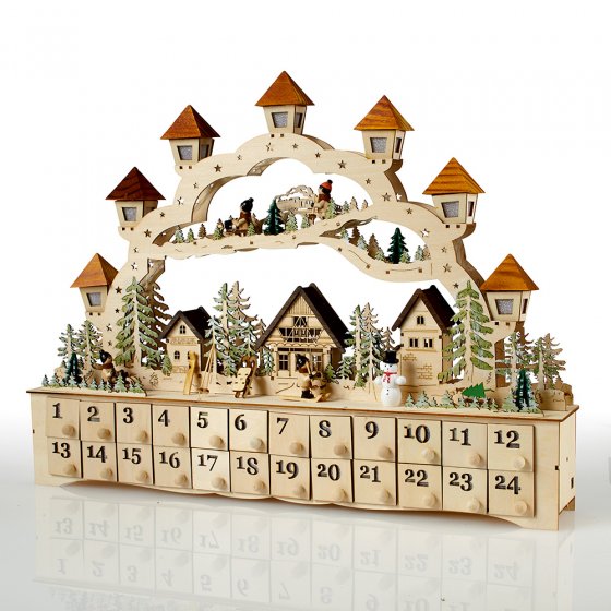 Is er iets mooiers dan de voorpret van Kerstmis? De GROTE LICHTBOOG MET ADVENTSKALENDER van hout is een artistieke versiering voor uw huis en maakt het wachten op het kerstfeest leuker dankzij de adventskalender met 24 genummerde kleine lades. Het magische winterdorp in het centrum is liefdevol gedetailleerd met talrijke lantaarns en effectief verlicht. Zelfs de cijfers op de kleine lades zijn zacht verlicht. Gevoed door de meegeleverde netadapter. Laden zonder inhoud. Afmetingen (l x b x h): ca. 57 x 9 x 42 cm. Een houten decoratie en tegelijkertijd een 'duurzame' adventskalender die elk jaar uw huis mooier maakt.