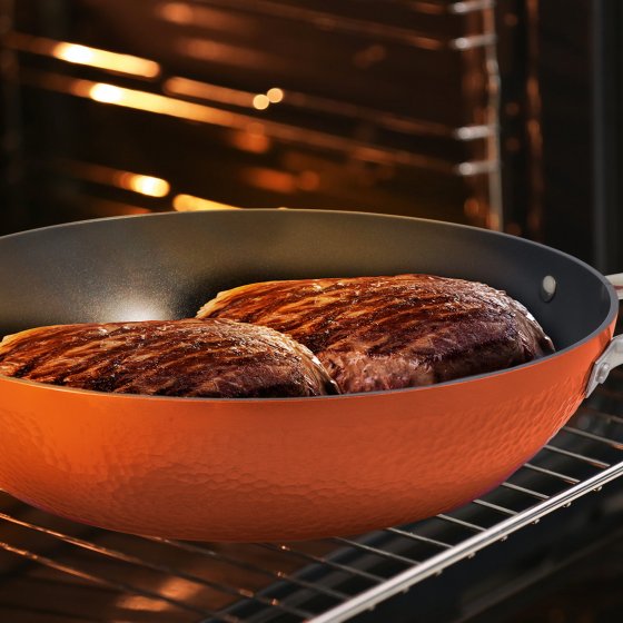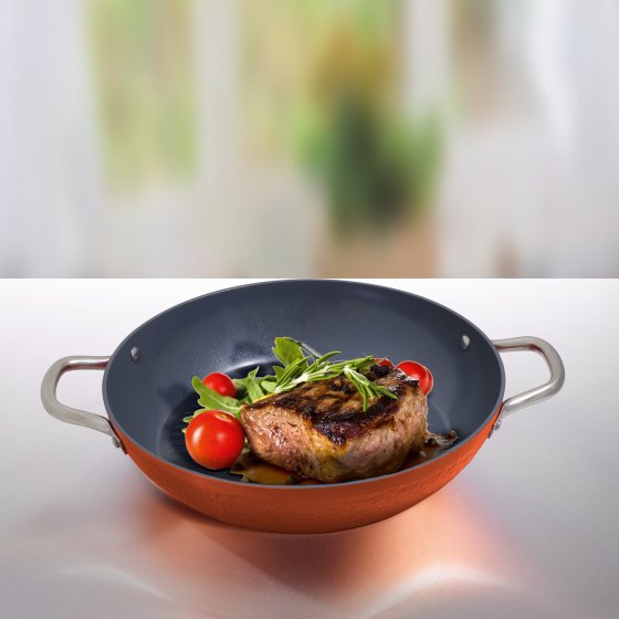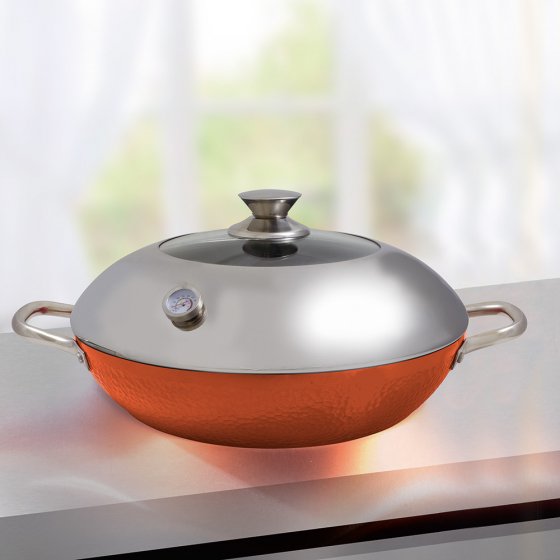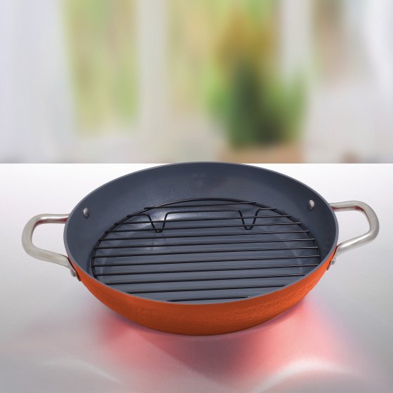 Een pan die nog veelzijdiger is dan deze GROTE PAN IN HAMERSLAG-LOOK is bijna niet te vinden: dankzij de hoge rand (7 cm) is de pan als bakpan én als braadpan te gebruiken. Met de meegeleverde stoominzet tovert u de pan bovendien om tot een stoompan. Omdat de grepen zijn gemaakt van edelstaal, kan de pan zelfs in de oven gebruikt worden (tot 220 °C) om te gratineren. De clou is de in de deksel van thermoglas verwerkte thermometer met temperatuursensor – zo is de gaartemperatuur in de gesloten pan af te lezen (perfect voor het garen bij lage temperaturen). Diameter: ca. 30 cm. Vier pannen in één – wat wil een mens nog meer?
