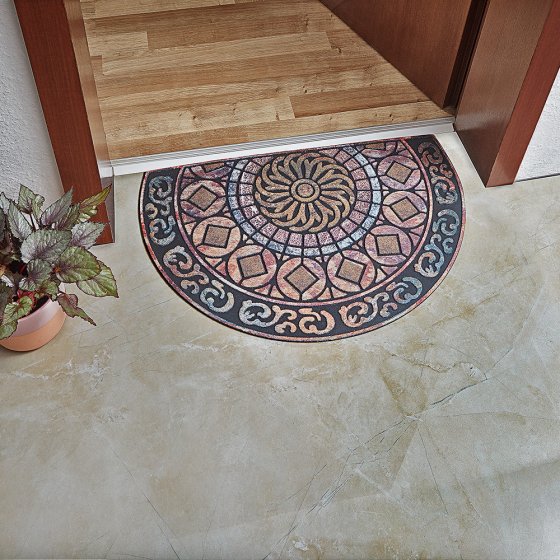 Zijn dat steentjes? Waar heb je die vandaan? Wees niet verbaasd als u de komende tijd veel vragen moet beantwoorden. De HALFRONDE MOZAÏEKMAT verbaast gewoonweg. Maar de mat ziet er niet alleen smaakvol en origineel uit. De geruwde oppervlakken nemen vuil uitstekend op. Steentjes en dergelijke verzamelen zich tussen de licht verzonken 'voegen' van het mozaïek en kunnen gemakkelijk weer worden verwijderd. De mat is weerbestendig en de rubberen antislip-onderkant hecht perfect aan de vloer. Afmetingen (l x b x h): ca. 40 x 60 x 0,6 cm. Laat u 'stap voor stap' overtuigen!