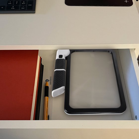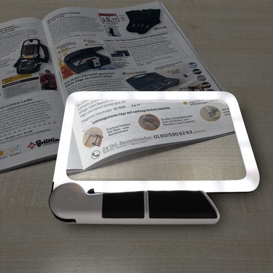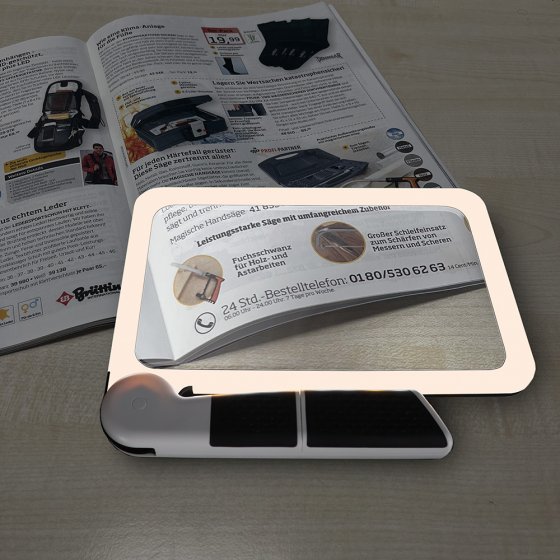 Handloepen in grootformaat hebben meestal dikke lenzen en zijn dienovereenkomstig zwaar. Dat geldt niet voor de HANDLOEP MET INSTELBAAR LICHT: ondanks een vergrotend beeld in DIN A5-formaat weegt hij slechts 170 g! Het geheim: de lens is een fresnellens. Fresnellenzen hebben ringvormige 'delen' in het glas, wat een extreem plat en daardoor lichtgewicht ontwerp mogelijk maakt. 48 leds in het vergrootglasframe verlichten met één druk op de knop het gezichtsveld in 3 selecteerbare lichtkleuren. Afmetingen (b x h x d): ca. 21 x 17 x 3 cm (gezichtsveld: 18,5 x 11 cm). Vergroting: 5x. Of u nu kleine lettertjes leest, knutselt of zeer fijne reparaties uitvoert: deze XXL-loep zal u goed van pas komen!