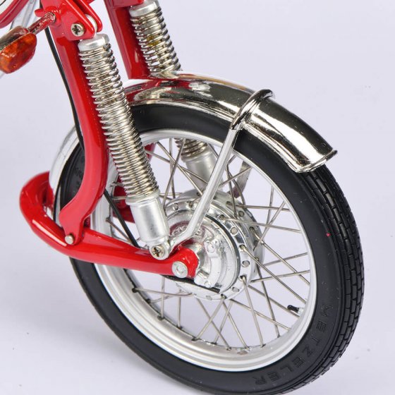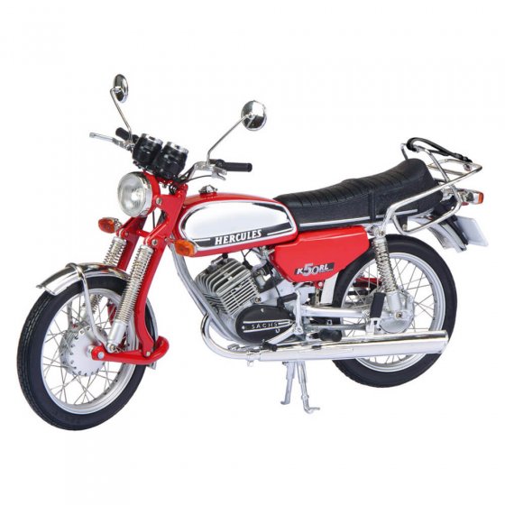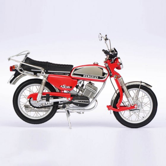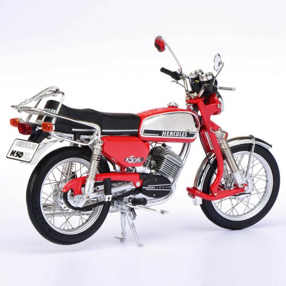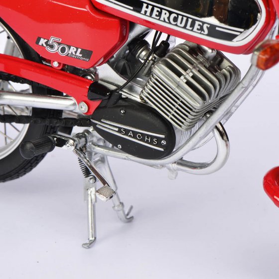 Ce modèle haut de gamme fabriqué à Nuremberg fut lancé sur le marché en 1975, à une époque où la marque Hercules était en concurrence constante avec Zündapp et Kreidler. La version HERCULES K 50 RL se distinguait principalement par sa forte proportion de chrome, sa couleur pimpante et sa longue fourche à ressort caractéristique. Avec 6,25 PS pour une cylindrée de 49 ccm, le cyclomoteur populaire pouvait aisément, dans sa version originale, atteindre une vitesse de 85 km/h. Ce modèle 1:10 en fonte de zinc injectée fascine par la grande richesse des détails, le nombre de pièces utilisées, ainsi que les suspensions avant et arrière fonctionnelles, les câbles Bowden, la peinture authentique avec éléments photogravés et les roues avec jantes à rayons métalliques et pneus caoutchouc ! Enrichissez votre collection de cette réplique fidèle du "cyclomoteur culte" des années 70 !