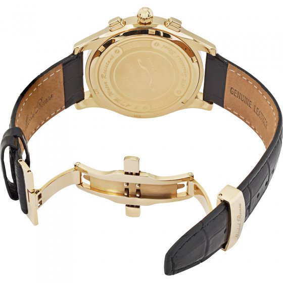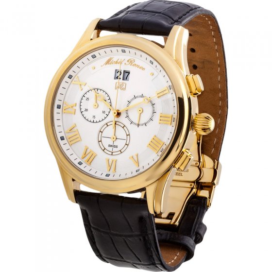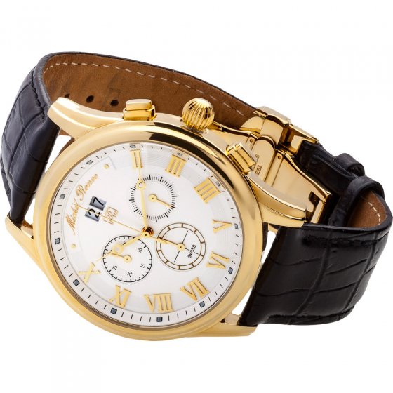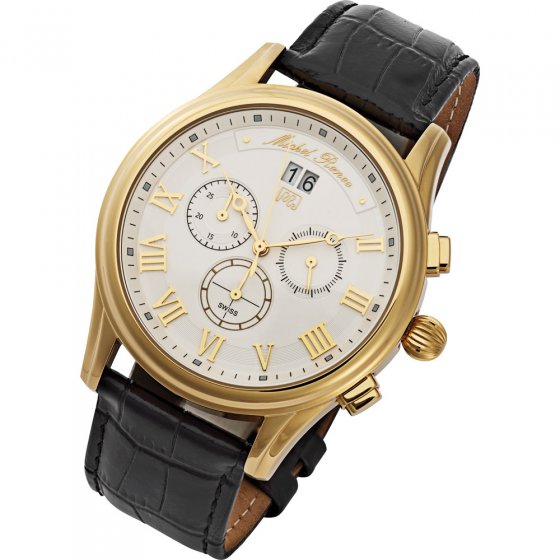 Hebt u een zwak voor de klassieke motorsport? Of neemt u misschien regelmatig deel aan gelijkmatigheidsrally’s of andere activiteiten, waarbij een precieze tijdmeting van het grootste belang is? Dan is het HERENHORLOGE 'GOLDEN CHRONO' iets voor u! Anders dan de meeste chronograaf-horloges met een analoge wijzerplaat klokt het de tijd niet alleen tot op de seconde gelijk, maar tot op tienden van seconden. Verder kunt u tussentijden opnemen, wat zelfs bij bijzonder hoogwaardige chronografen niet vanzelfsprekend is. De datumaanduiding in de 12-uurspositie onderstreept de technologisch hoogwaardige kwaliteit van dit jumping-hour-horloge. Ondanks zijn sportieve karakter past de ’Golden Chrono’ ook prima bij uw avondkleding: de wit glanzende wijzerplaat met speciale zilverkleurige finish en de vergulde behuizing geven het horloge een klassieke en elegante uitstraling. Diameter behuizing: ca. 44 mm. Dikte behuizing: ca. 9 mm. De ’Golden Chrono’ wordt geleverd in een representatieve cadeauverpakking. Gun uzelf iets bijzonders en beleef ’gouden tijden’!