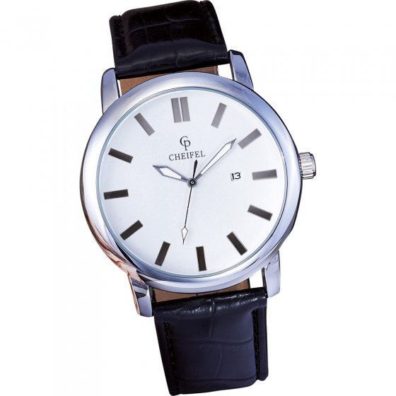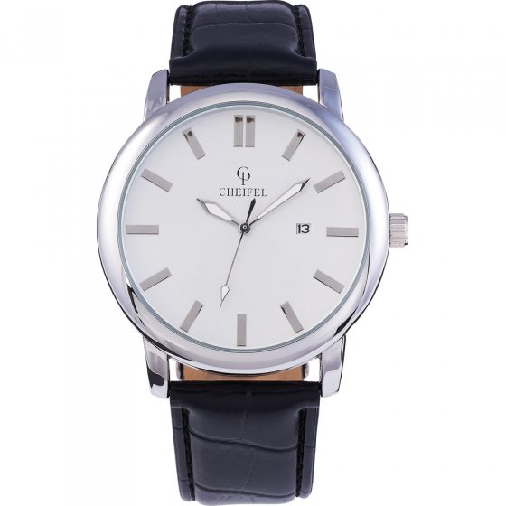 Hij plaatst een stijlvol design op de voorgrond en overtuigt met zijn functionaliteit, elegantie en degelijkheid. Met zijn grote kastdiameter van ca. 45 mm en opvallende indexen is hij vervaardigd voor een rijpe mannelijke verschijning! Het zwarte horlogebandje van imitatiekrokodillenleer houdt de zilverkleurige ingewerkte kast met witte wijzerplaat op zijn plaats. Ook de datum wordt perfect weergegeven door het zeer precieze kwartsuurwerk. Hierdoor past dit goed afleesbare herenhorloge aan elke pols en ziet hij er tegelijkertijd stijlvol en robuust uit. Supervlak, aangenaam licht en makkelijk te combineren met zowel sportieve als elegante kledij. Dit horloge is de perfecte begeleider voor elke gelegenheid en u zult er altijd indruk mee maken.