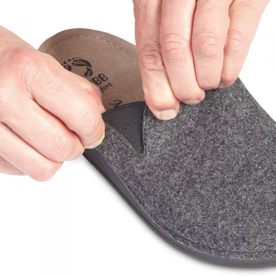 Wolvilt van zuiver schaapswol verwarmt uw voeten en voorkomt transpireren. Met deze heren-slippers profiteert u optimaal van deze natuurlijke eigenschappen – ook op warme dagen! Het met leer beklede memory-voetbed zorgt voor een zachte stap. De zool met thermoplastisch natuurrubber biedt een goede grip. Ook het dragen van deze slippers zonder sokken is heerlijk, dankzij de comfortabele binnenzool van suèdeleer. Materiaal/voering: wolvilt, zool: PU/TR.
