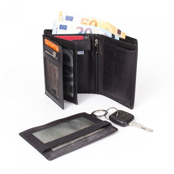 Een portemonnee voor vrijwel elke gelegenheid: deze HERENPORTEMONNEE 2-IN-1 van chic buffelleer bestaat uit 2 delen, die kinderlijk eenvoudig en razendsnel met een spanelastiek samen zijn te voegen en uit elkaar te halen zijn. Zo hebt u indien nodig de complete portemonnee bij de hand of onderneemt u uitjes met een kleinere uitvoering (incl. sleutelring) – zonder omslachtig ombouwen. Beide delen van de herenportemonnee zijn RFID beschermd. Afmetingen (l x b x h): ca. 2 x 9,5 x 12,5 cm. Want tijd is geld zoals u weet.