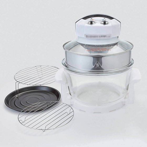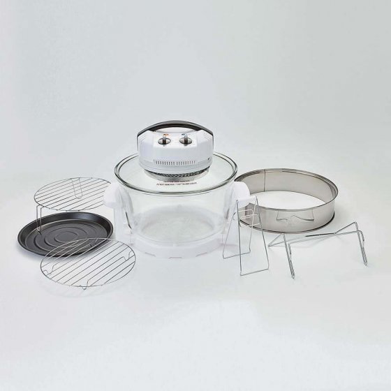 Koken, braden, bakken, roosteren, ontdooien, opwarmen, frituren, grillen – met de HETELUCHTOVEN EN -GRILL 'DELUXE' is veel mogelijk en lukt alles perfect. Hij gaart uw gerechten gelijkmatig, zonder dat u iets hoeft om te keren en in de helft van de normale tijd. De met licht werkende hete lucht circuleert zoals bij een heteluchtoven, maar verbruikt echter max. 1400 W, terwijl een gewone oven max. 3.000 W verbruikt. De inhoud van de gaarbak van veiligheidsglas is goed te bekijken, zonder dat u de deksel hoeft te openen. De gaarruimte met een inhoud van 12 l is met behulp van de meegeleverde verhogingsring zelfs te verruimen tot een royale 17 liter. Afmetingen zonder verhogingsring (Ø x h): ca. 33 x 30 cm. Werkt op 230 V. Zonder toevoeging van vet blijven nagenoeg alle vitaminen, mineralen en voedingsstoffen behouden. Met deze oven maakt u heerlijke en vetarme maaltijden.