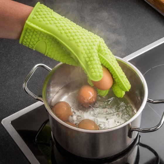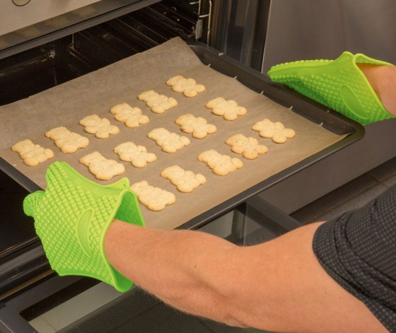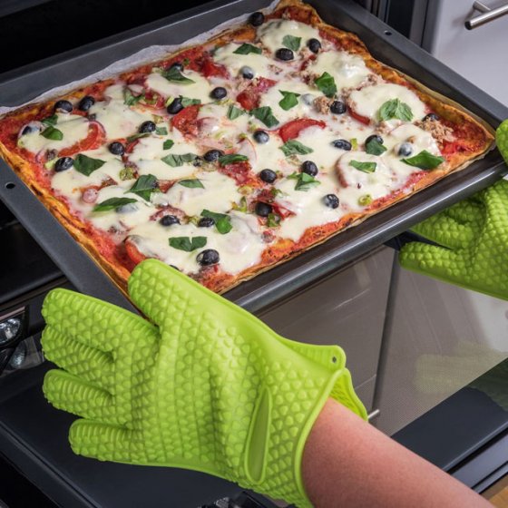 De gebraden gans is klaar. Hoe haalt u de braadpan uit de oven zonder brandblaren te riskeren? Bescherm u met de HITTEBESTENDIGE SILICONEHANDSCHOENEN. Daarmee beschermt u uw handen en zelfs uw gewrichten tegen verbrandingen, met een gegarandeerd stevige grip. Hiermee opent u ook schroefdoppen en -sluitingen zonder krachtsinspanning. Wilt u het hout voor de open haard aanvullen? Trek gewoon deze praktische handschoenen aan en u bent beschermd. Te bestellen in één maat. Ook handig om uw kerstbaksels mee te pakken in plaats van met de pannenlap.
