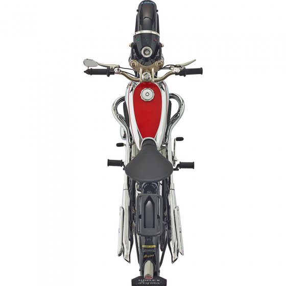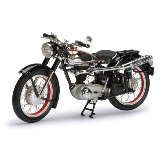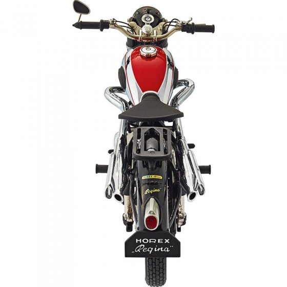 Ce modèle de pointe a rendu possible l’essor longtemps attendu suite à la réforme monétaire de 1948 ! Le lancement de la nouvelle HOREX REGINA 350 (fabriquée de 1953 à 1956) a permis au constructeur Horex de rencontrer enfin le succès. La pré-série a été fabriquée dès 1949. Son moteur puissant, identique à celui de la Victoria KR 35, constituait une base idéale. Avec plus de 80 000 exemplaires vendus jusqu’en 1956, la Regina (moteur quatre temps bicylindre, 19 CH pour 6200 tours/min, vitesse maximale 126 km/h) a été un best-seller inattendu. Cette reproduction de qualité en zinc moulé sous pression à l’échelle 1:10 compte plus de 100 pièces individuelles. Avec laque brillance extrême authentique, roues mobiles avec pneus, suspensions fonctionnelles et véritables câbles de traction. Comme l’original, ce véhicule incarne la classe dans les moindres détails et illustre la devise d’une nation en plein devenir : « Nous allons de l’avant! ».