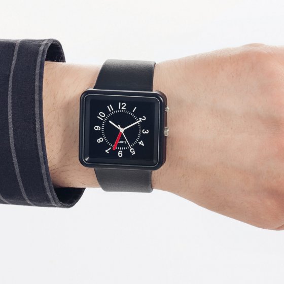 nodig! Eenvoudig de pin uittrekken en stel het alarm in met de rode indicator, een staduim verder de tijd, pin weer induwen - klaar! Een extra knop wordt gebruikt om het alarm uit te schakelen . Zeer gemakkelijk te hanteren, zoals de wekker van vroeger ! Overigens, deze sportieve horloge met analoge wijzerplaat en helder, vierkant design is zeer gemakkelijk te lezen. Het heeft een hoge precisie Myota Japanse quartz uurwerk, een lederen band en een behuizing van geëmailleerde aluminium met roestvrij