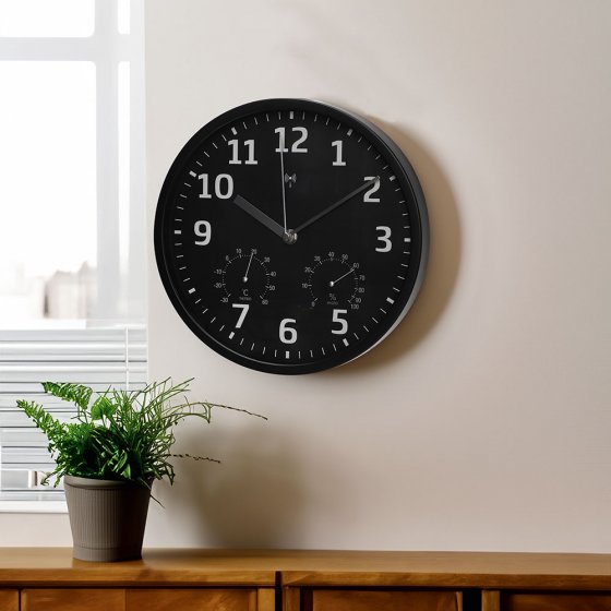 L'HORLOGE MURALE RADIOPILOTÉE « THERMO/HYGRO » ne se contente pas d'indiquer l'heure (et ce avec la précision extrême du récepteur de signal horaire DCF77), mais elle informe aussi sur la température ambiante et l'humidité qui règne dans l'air de la pièce ! Toutes les données sont très faciles à lire sur l'affichage contrasté blanc sur noir. Dimensions : Ø env. 25 cm, épaisseur du boîtier env. 4 cm. Fonctionne avec une pile AA (vendue séparément).
