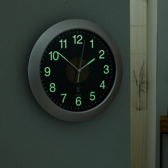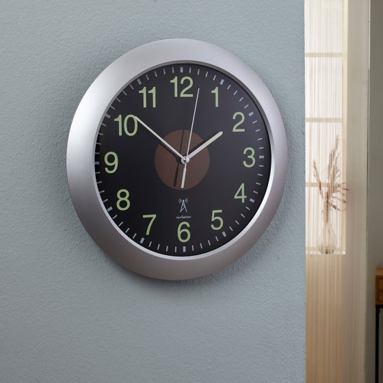 Avec l'HORLOGE MURALE SOLAIRE RADIOPILOTÉE « HYBRID » vous êtes à la pointe du progrès, et ce à plus d'un titre. D'une part vous démontrez ainsi votre sens du développement durable, car l'horloge, bien qu'équipée d'un mouvement à quartz, fonctionne sans pile et tire son énergie de la lumière du jour. (La nuit, elle passe en mode batterie, laquelle stocke le courant pendant la journée à l'aide du panneau solaire intégré dans le cadran.) D'autre part, vous profitez de la technologie radio, la plus précise des technologies de mesure du temps qui soit. De plus, les chiffres de l'horloge sont dotés d'un revêtement spécial luminescent, et sont donc visibles dans le noir. Matière plastique avec glace en verre acrylique. Dimensions : Ø env. 30 cm, épaisseur du boîtier env. 6 cm. Faites entrer la modernité chez vous !
