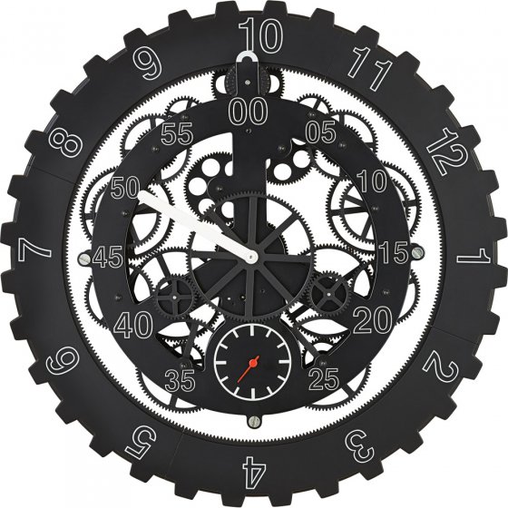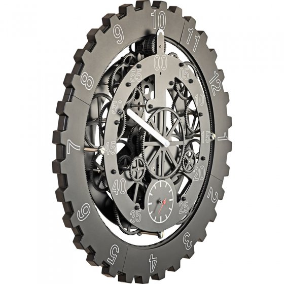 Vous vous intéressez aux horloges et vous appréciez les prouesses techniques ? Alors observez de près notre HORLOGE MURALE "TRANSMISSION" ! Cette horloge n'a pas d'aiguille des heures et pourtant vous pourrez voir immédiatement s'il est l'heure de manger ou l'heure du journal télévisé : une prouesse d'horlogerie extraordinaire ! Outre ses dimensions imposantes et son design "squelette" sans boîtier qui vous permet de voir son mécanisme complexe, cette horloge à transmission se distingue également des horloges traditionnelles par son mode de fonctionnement particulier : au lieu que ce soit l'aiguille des heures qui se déplace, c'est le boîtier qui avance ! La couronne dentée externe, sur laquelle sont inscrites les heures de 1 à 12, est comme suspendue au-dessus de la construction et elle est entraînée par un petit rouage qui lui permet de tourner complètement en l'espace de 12 heures. Les minutes et les secondes, en revanche, sont indiquées par des aiguilles mobiles situées sur la couronne intérieure en fer massif. Fonctionne avec 2 piles AAA (vendues séparément). Matière : fer et plastique ABS (couronne extérieure). Diamètre env. 46 cm. Épaisseur env. 9 cm. Observez de quelle manière la roue du temps tourne lentement mais sûrement !
