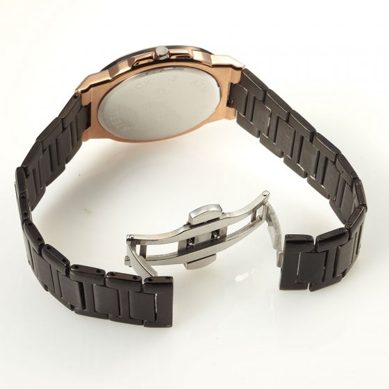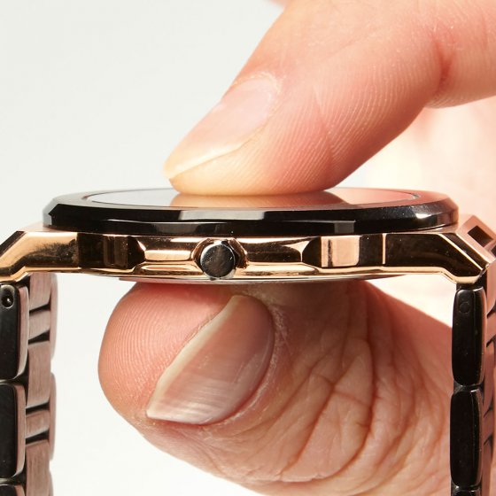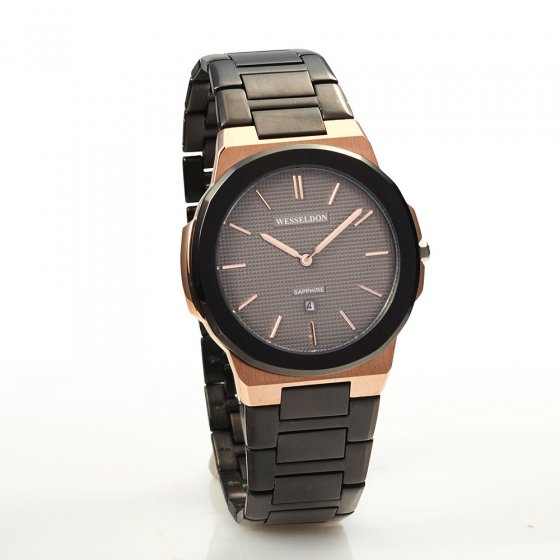 Iedereen die horloges waardeert die tegen een stootje kunnen zonder een lompe uitstraling te hebben, zal blij zijn met HORLOGE 'SAFFIER': de kast van geborsteld roestvrij staal is zeer plat en, dankzij een afdekking van saffierkristal, vrijwel ongevoelig voor krassen en schuursporen. De roestvrijstalen band sluit naadloos aan op de kast; vuildeeltjes kunnen nauwelijks doordringen tot de aansluitpunten. Het horloge valt op door een guilloché wijzerplaat (= bedekt met fijne gegraveerde lijnen) en een hoogglans gepolijste kastinzet. Afmetingen: Ø ca. 40 mm, dikte kast slechts 8 mm. Zo plat en mooi kan een robuust horloge zijn!