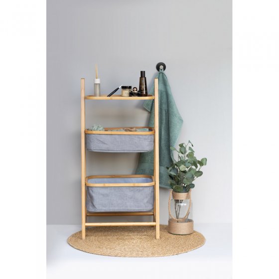 Hebt u nog opbergruimte nodig in de badkamer, gastentoilet of woonkamer, maar wilt u daar geen plank ophangen? Het superlichte HUISHOUDREK MET OPBERGRUIMTE staat op de vloer. In de twee manden kunnen handdoeken, badkamerspullen, tijdschriften of (in de woonkamer) afstandsbedieningen en oplaadkabels opgeborgen worden; het planchet biedt ruimte aan glazen, kaarsen of decoratieve voorwerpen. Aangezien het frame van bamboe is gemaakt, is het bijzonder geschikt voor vochtige ruimten. Met twee geïntegreerde grijze legplanken, telkens tot 5 kg belastbaar. Afmetingen (b x h x d): ca. 44 x 91 x 34 cm. Creëer opbergruimte, zonder te boren!