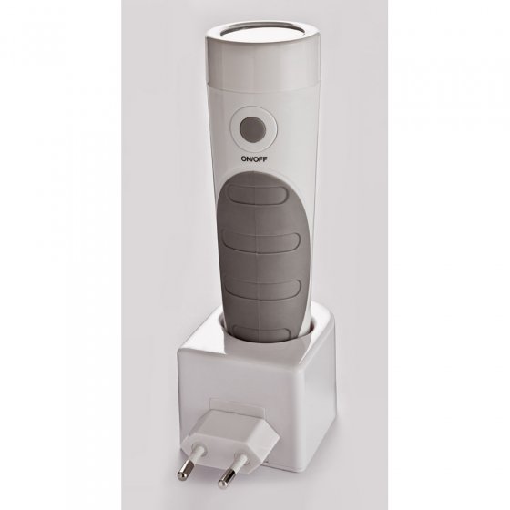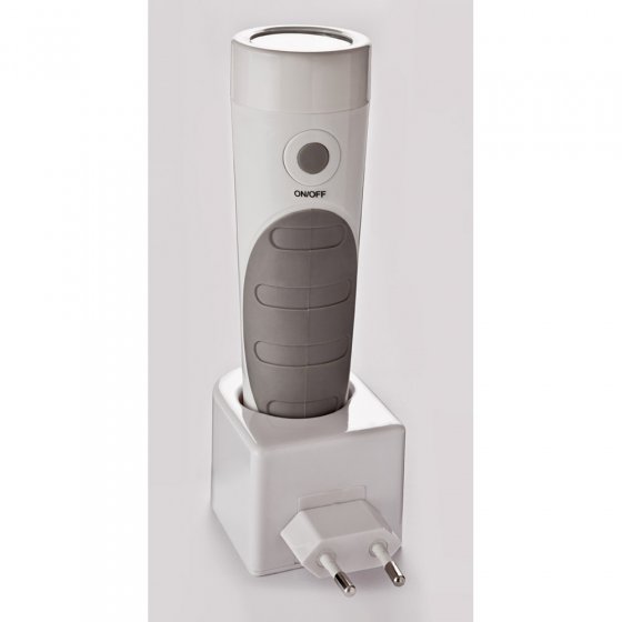 krachtige noodlamp. Het opladen functioneert door inductie: er zijn geen contacten zichtbaar in de sokkel. U kunt de lamp er zelfs nat inzetten. Levering met oplaadsokkel en 3,7 V/650 m Ah Li-ion-batterij. Afmeting ca. 10 x 5,5 x 17 cm. Een technologisch top moderne, clevere 4-in-1-lamp, waarmee u dagelijks nieuwe doeleinden zult ontdekken.