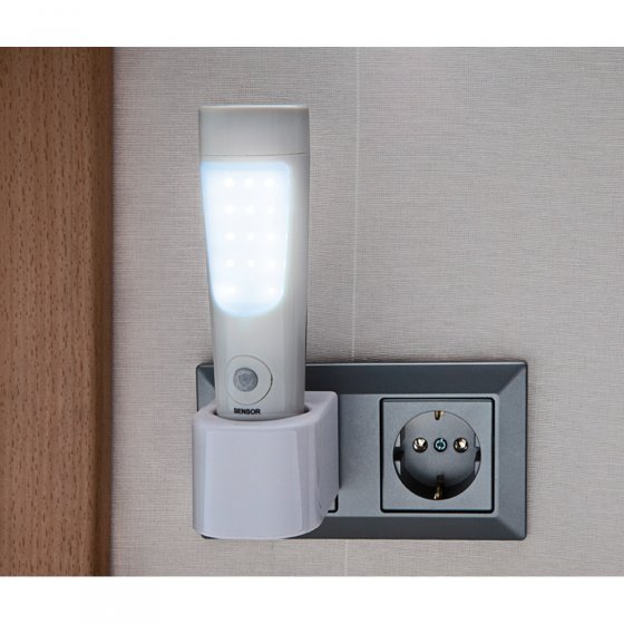 bovenkant een sterke zaklamp Door de bewegingssensor gaat de lamp (nachtlicht) bij donkerheid automatisch aan zodra er binnen 2-3 meter een beweging waargenomen wordt. Na 25 sec. gaat hij automatisch weer uit. Erg handig, als u ‘s nachts opstaat! Ook als de stroom is uitgevallen gaat de lamp automatisch aan en u heeft een