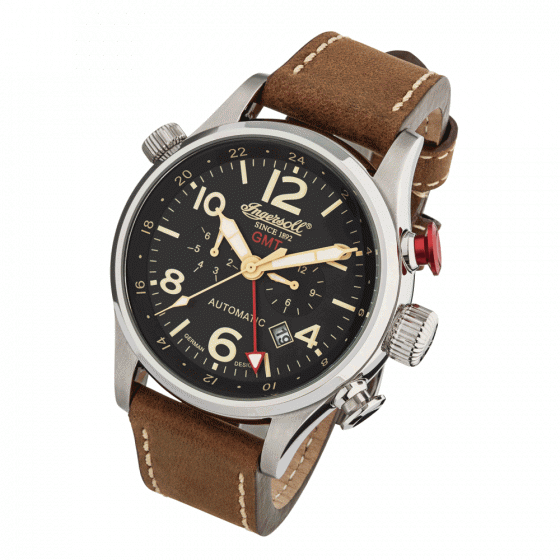 Bewezen is: Zelfs persoonlijkheden als wereldzeiler Thomas Drake en de uitvinder Thomas A. Edison had vertrouwen in de precisie van hun Ingersoll horloges. En er is daarvoor reden. Omdat de uitstekende uurwerken van de fabrikant van dit horloge meesterwerken zijn! Zo ook de markante, robuuste INGERSOLL "LAWRENCE". De speciale touch om van dit model een begeerd stuk te maken! Vooral de weergave van GMT (Greenwich Mean Time, de gemiddelde zonnetijd op de nulmeridiaan) met de rode indicator en de trekker op de twee in het rood op de dag van de week in te stellen. Ook zeer zelden: de datum venster tussen vier en vijf uur. Massieve roestvrijstalen kast (Ø 46 mm), hoogglans gepolijst. Gehard mineraal glas, waterdicht tot 5 ATM. De glazen bodem geeft vrij uitzicht op de automatische Caliber 619, bewerkt met 20 edelstenen. Exclusieve zwarte wijzerplaat met fijne crème-gekleurde wijzers en uur markers (verlichte uur en de minuut wijzer),. Centraal secondewijzer. Zacht gevoerde