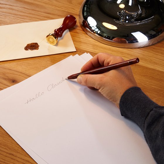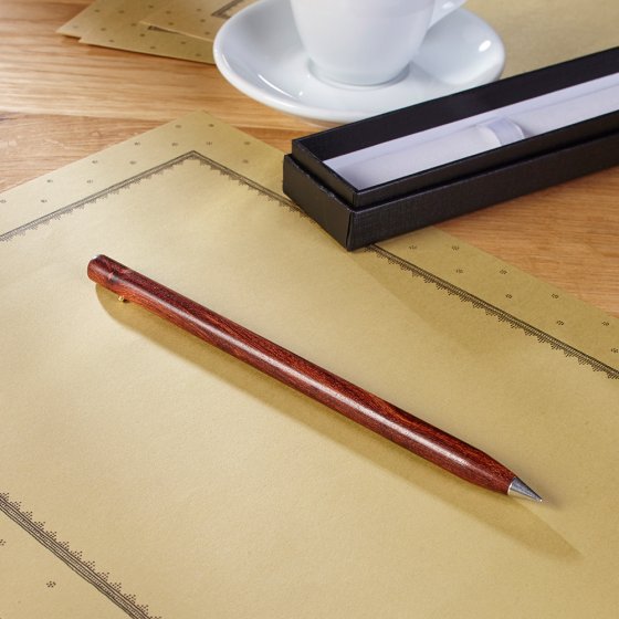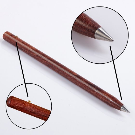 Het principe is al sinds de Romeinse oudheid bekend: puntige metalen pennen, b.v. zilveren of tinnen pennen produceren bijvoorbeeld fijne metaalslijtage bij het schrijven op papier, wat qua kleur vergelijkbaar is met de slijtage van grafietpotloden (algemeen bekend als 'potloden'). In tegenstelling tot potloden slijten metalen pennen echter nauwelijks. U kunt de INKTLOZE METALEN PEN SANDELHOUT daarom met een gerust hart beschouwen als een pen met 'eeuwigdurende' vulling – en dus als een milieuvriendelijk alternatief voor potloden en balpennen. Het etui is gemaakt van zacht rood sandelhout en voelt aangenaam aan. Lengte: ca. 16 cm. Schrijf en teken opnieuw – op een duurzame manier!