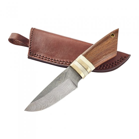 “Dieses Jagdmesser hat eine schöne Damast-Maserung, die durch die Breite der Klinge besonders zur Geltung kommt.Das Messer liegt gut in der Hand.Es ist sauber verarbeitet,scharf und spitz.Der Griff ist glatt.Da hakt nichts.-Eines meiner Favouriten!”