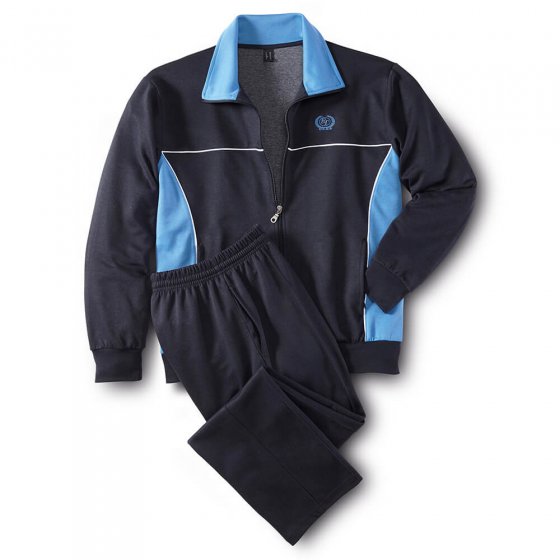 In dit JERSEY-VRIJETIJDSPAK kunt u heerlijk ontspannen, sporten of genieten van de vakantie! En dat met veel stijl en zeer veel draagcomfort. Dit pak is gewild om zijn zachte jerseykwaliteit, die soepel meebeweegt, maar ook stevig en vormvast is. Vlot en sportief jasje met staande/liggende combi-kraag en 2 zakken met rits. Met contrasten en een sierpaspel en op borsthoogte fijn geborduurd. De broek heeft een elastische band met elastiek en 2 steekzakken. Het pak is gemaakt van 85% polyester en 15% katoen, gemakkelijk in onderhoud en wasbaar. Gun het uzelf!