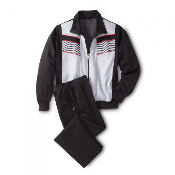 Supercomfortabel voor thuis om heerlijk in te ontspannen, verzorgd en netjes voor in een wellness-resort: in dit aantrekkelijke JERSEYVRIJETIJDSPAK voelt u zich overal op uw gemak en slaat u bovendien een goed figuur! Het soepele tricot beweegt mee en is toch stevig genoeg om duurzaam in model te blijven. Het bijzondere aan het jack: een contrasterend gedeelte voor met strepen, 2 steekzakken en elastische mouw- en zoomboordjes. De broek met elastische band en rijgkoord en ingestikte vouw voor heeft 2 ritszakken. 85% polyester, 15% katoen, wasbaar. Een "welness-pak" voor stijlvolle mannen!