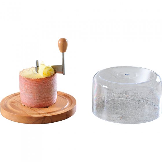 U hebt ze vast en zeker wel eens gezien, de flinterdunne 'kaasroosjes' die menig buffet decoreren. Ze zien er niet alleen mooi uit, maar smaken ook heerlijk bij een goed glas rode wijn en druiven. Maar weet u hoe u ze kunt maken? Dat doet u met een speciale ronde kaasschaaf die in de 12e eeuw werd ontwikkeld in klooster Bellelay in het Zwitserse kanton Jura. De KAASKRULLER MET STOLP wordt vooral gebruikt voor Tête-de-Moine-kaas ('monnikskop' in het Nederlands) – hiermee maakt u de mooiste kaasroosjes. U plaatst de kaas op de pin in het midden van het beukenhouten plateau en snijdt de korst van de bovenkant af. Nu kunt u er met het lemmet perfecte kaaskrulletjes afschrapen. De vier weerhaken in het plateau zorgen ervoor dat de kaas stevig op zijn plaats blijft. Hoogte in totaal: ca. 16 cm. Diameter plateau: ca. 21 cm. Een vershoudstolp wordt meegeleverd. Tip: vervang de kaas eens door een blok chocolade en uw gasten raken niet uitgepraat over deze culinaire verrassing!
