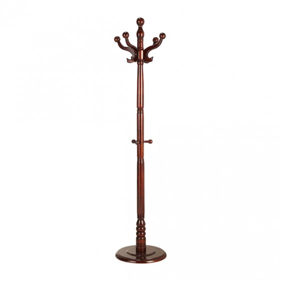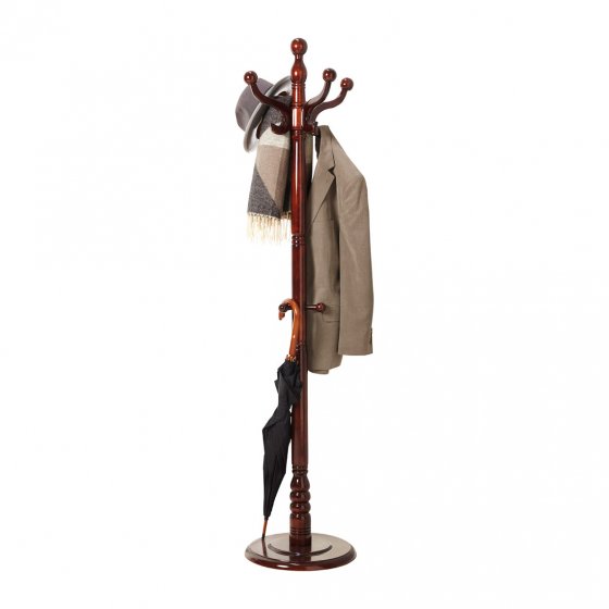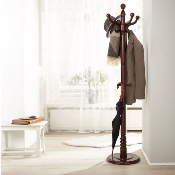 Wat zien uw gasten als eerste in de hal, het visitekaartje van uw huis? De kapstok voor mantels, jassen en hoofddeksels. Kies met onze KAPSTOK 'MAHAGONI' voor een echte klassieker. Zijn gebogen kroon met gedraaide knoppen is een indrukwekkende blikvanger. De kapstok is heel geschikt om hoeden op te hangen. Halverwege bevinden zich haken voor paraplu's. Materiaal: berkenhout, gelakt, in mahonie-look. Afm.: hoogte ca. 180 cm, voet (Ø) ca. 40 cm. Gemakkelijk zelf in elkaar te zetten. Heet uw gasten stijlvol welkom.
